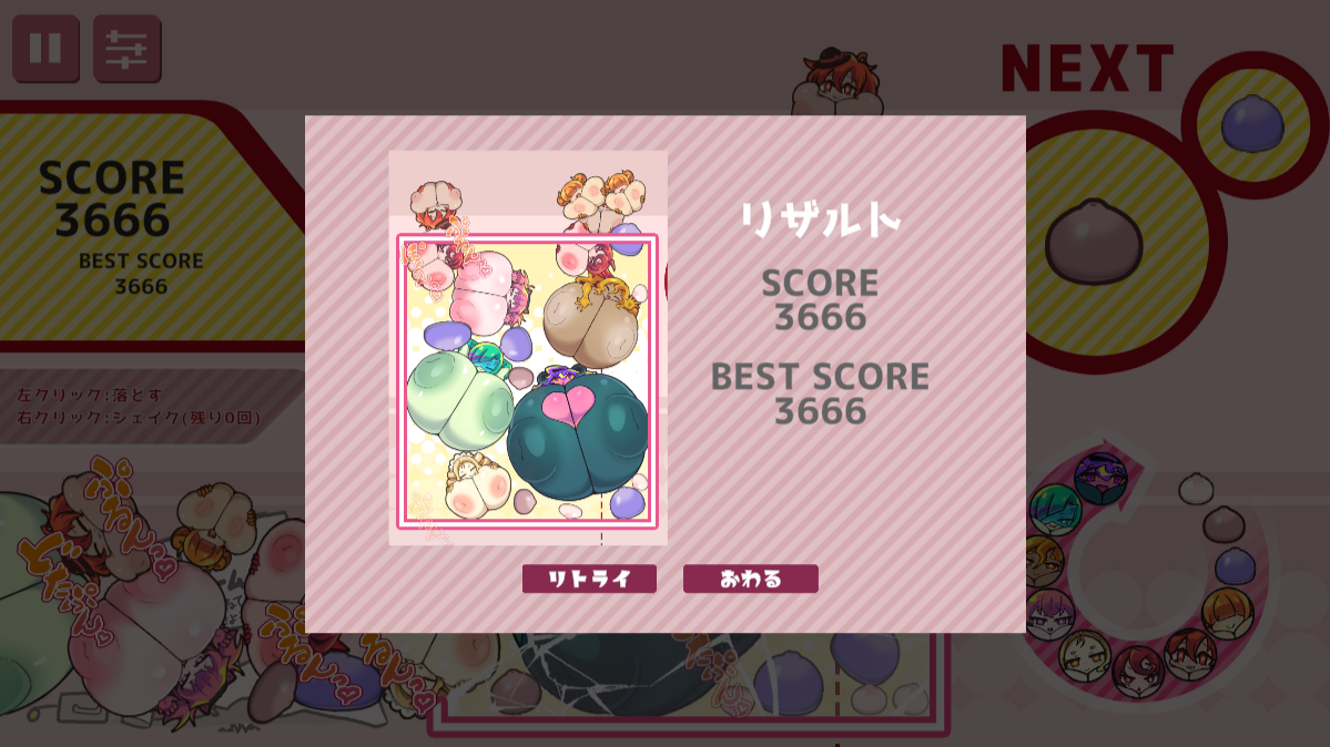 I've play a sizable buttload of suika-likes, and this one definitely has the bounciest physics. Well made game though. Didn't realize there was a nudge button until after I completed my first run (2707 victory) and used a translator . Pretty novel concept for a mechanic, yet surprised I haven't seen it before. Could be a cool special ability in a multiplayer puzzle battler suika -like maybe.